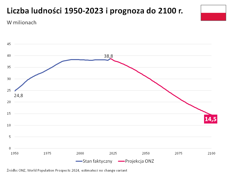 Raport ONZ "World Population Prospects 2024" prognozuje, że pod koniec XXI wieku liczba ludności w Polsce spadnie do około 19,4 milionów osób. Pierwsze oznaki depopulacji będą widoczne już w 2030 roku, kiedy liczba ludności spadnie do 37,29 milionów z obecnego poziomu 38,7 milionów.